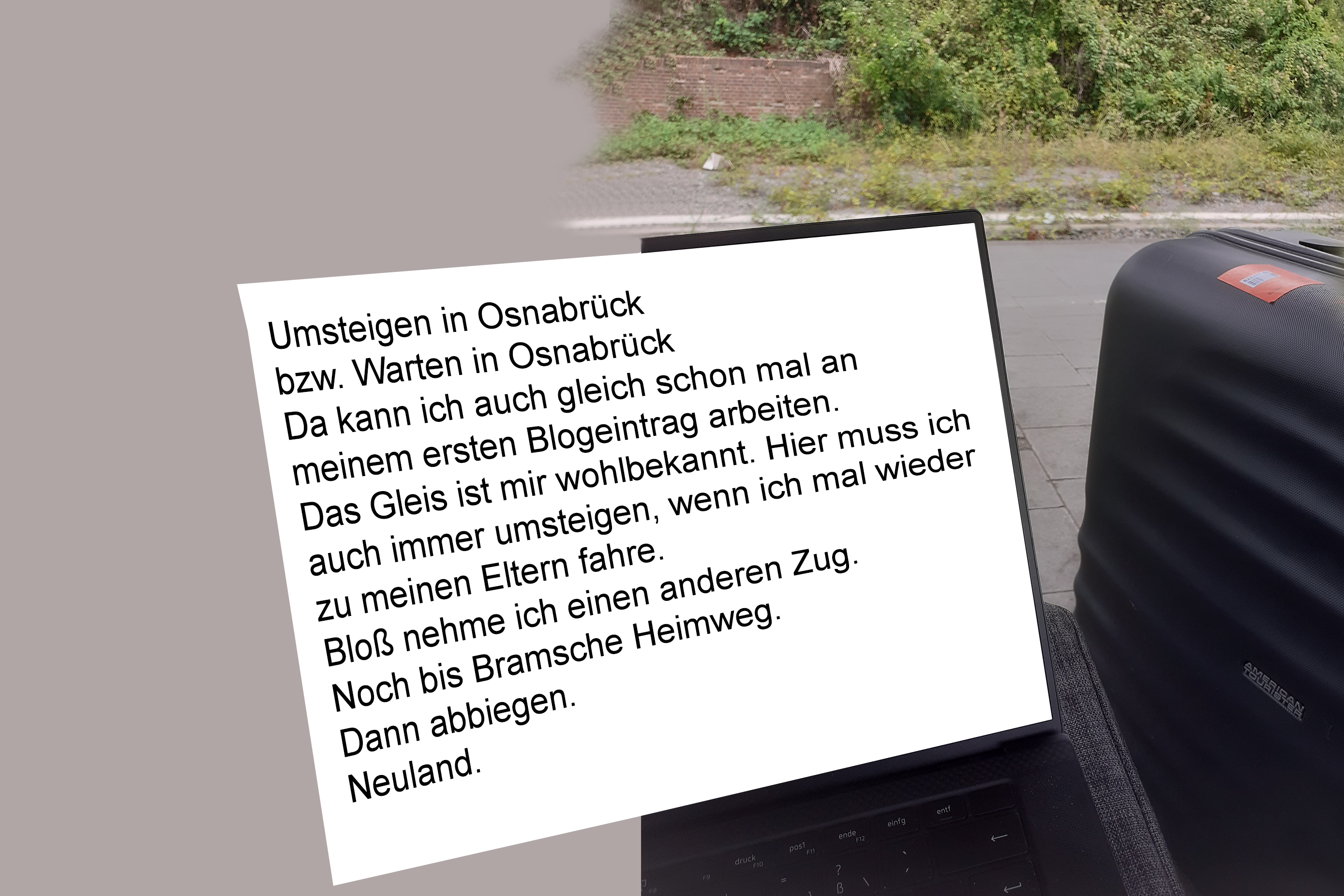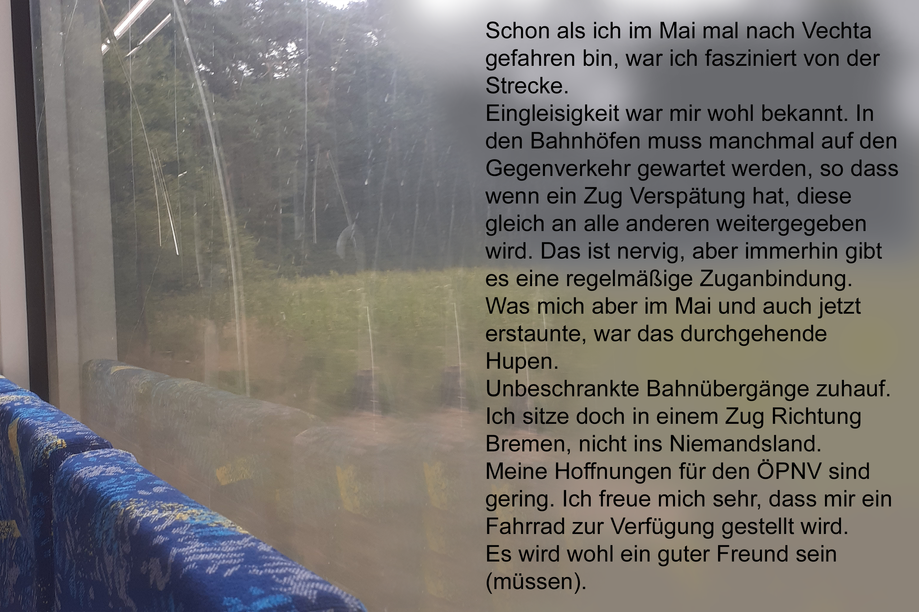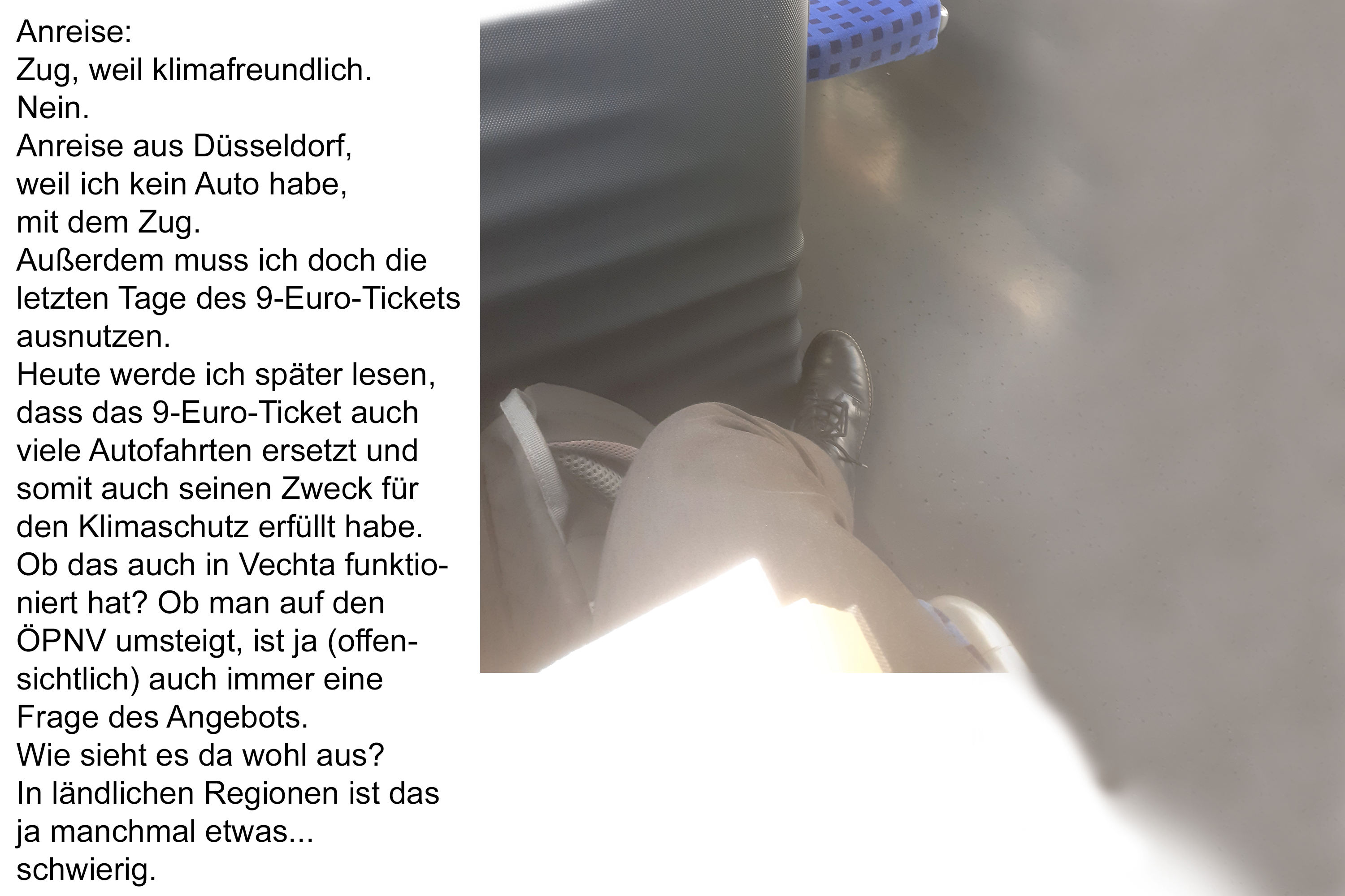 Zug Düsseldorf-Osnabrück 1 Anreisen und Ankommen Beitrags-Autor:Miriam Bornewasser Beitrag veröffentlicht:31. August 2022 Beitrags-Kategorie:Miriam Bornewasser Zug Düsseldorf-Osnabrück Bahnhof Osnabrück Zug Osnabrück-Vechta Alte Mühle Wald/Golfplatz Weitere Artikel ansehen Vorheriger BeitragMoin! Nächster Beitrag2 Erkundungen bei Sommerwetter Das könnte dir auch gefallen Einladungen zu einer Diskussion und einer Lesung 7. September 2022 9 Abreise mit dem Geisterzug 9. Oktober 2022 4 Stadt, Land, AAAAAAH! oder Zahlen machen Spaß, oder? 14. September 2022